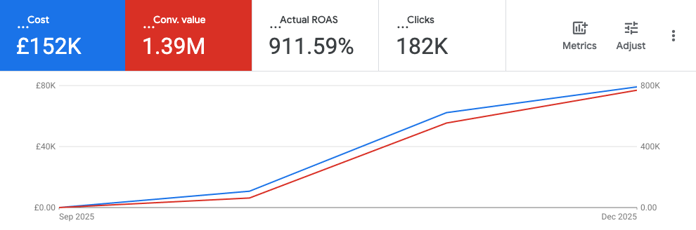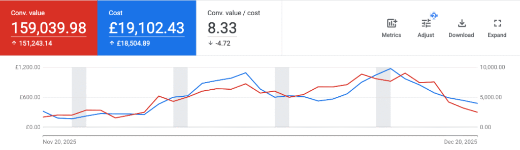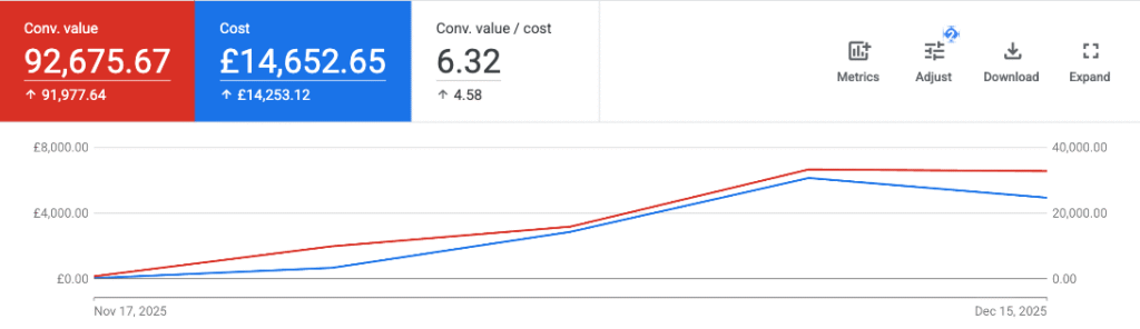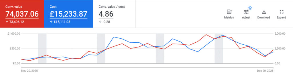 At that point the account was generating around £20K in sales with a strong ROAS, but that was expected. It was brand traffic only.