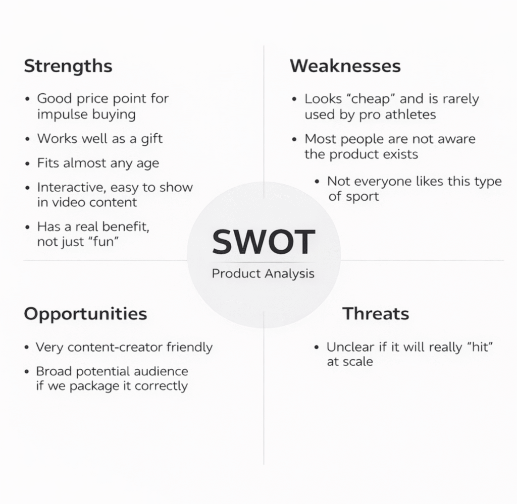 Before building campaigns, we did a simple SWOT on the product. The goal was not to look smart. The goal was to understand what we can lean on, what can hurt us, and who we should not target from day one.