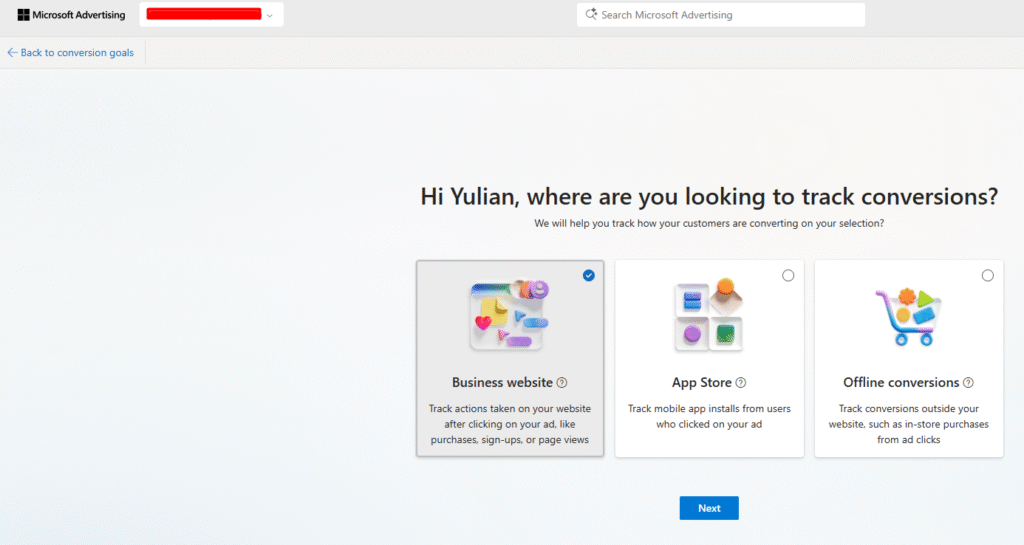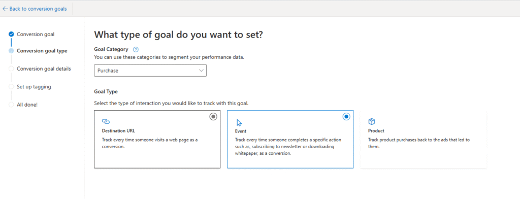 You’ll define what kind of event Microsoft should consider a conversion (e.g. a purchase).